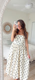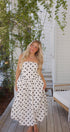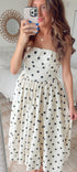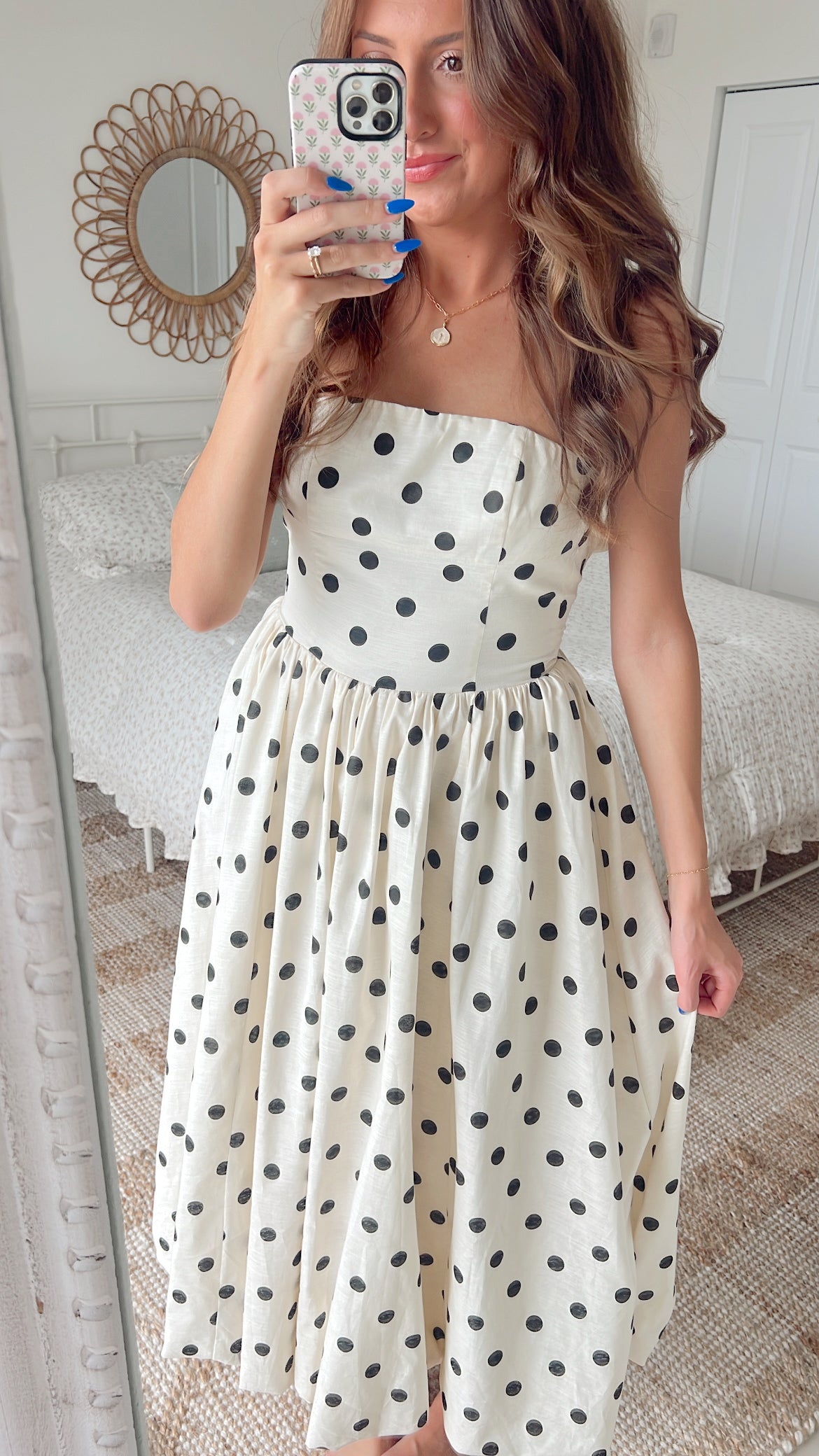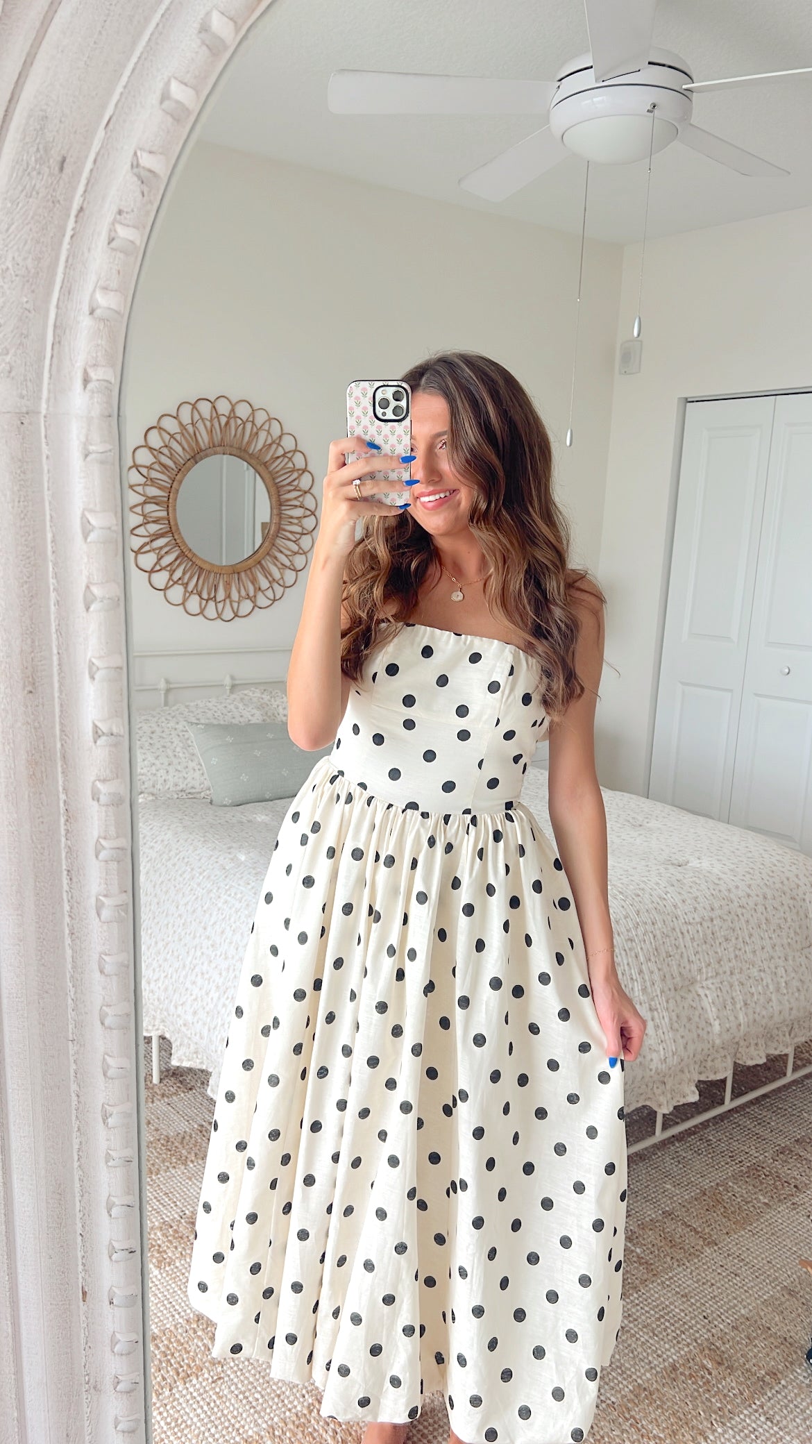 Playful, timeless, and effortlessly polished, the Audra Midi Dress is a piece that instantly stands out. Designed with a strapless silhouette and classic polka dot print, this dress brings a charming vintage-inspired feel while still feeling modern and easy to wear.