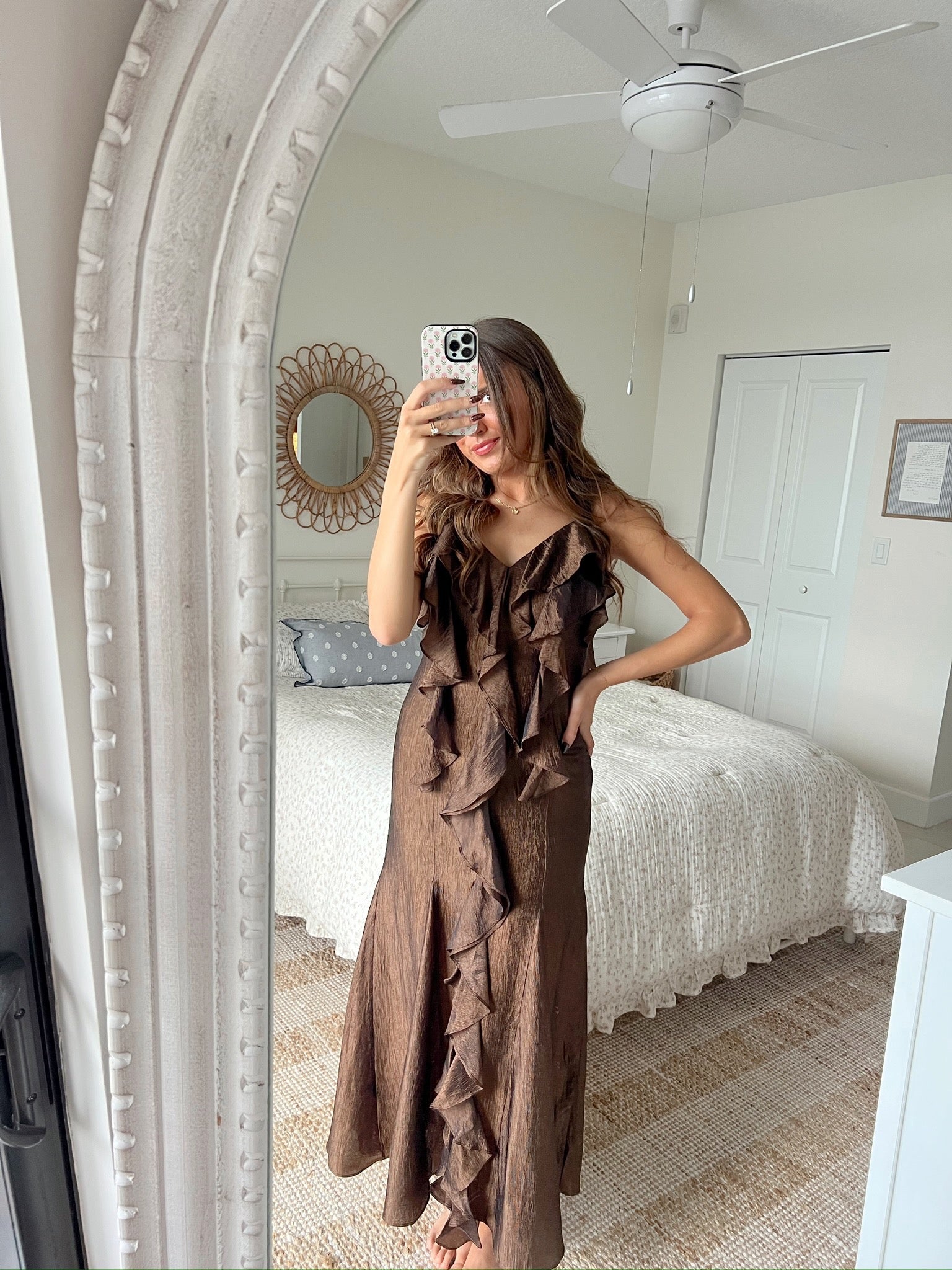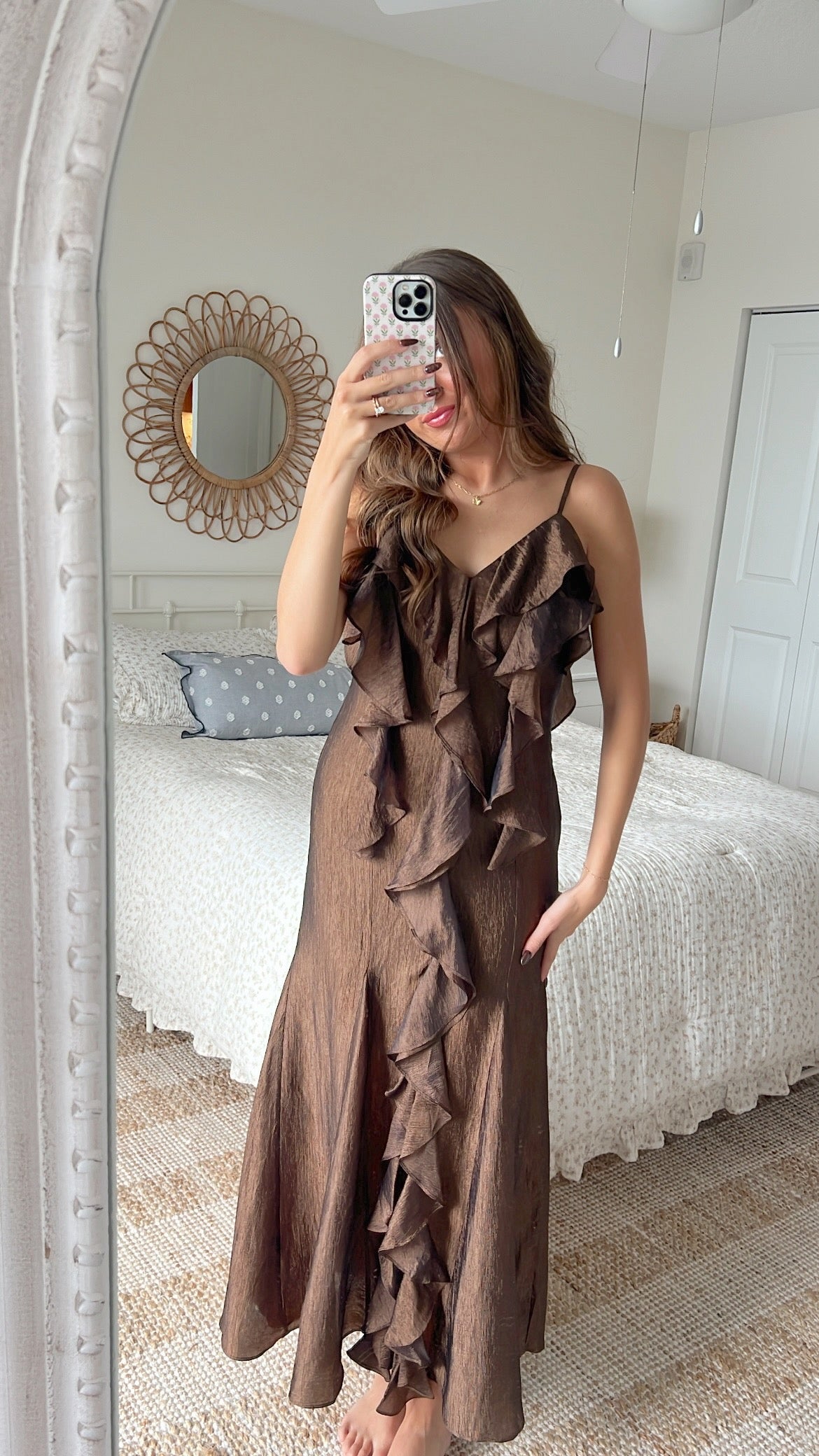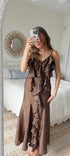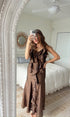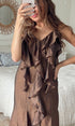 The Blair Ruffle Maxi is a graceful statement piece, designed with cascading ruffles that fall from neckline to hem. Crafted in a bronze, lightly textured fabric, it offers movement and elegance in every step. Finished with delicate straps and a flowing maxi length, it’s a timeless dress for special gatherings, celebrations, or evening occasions.