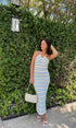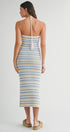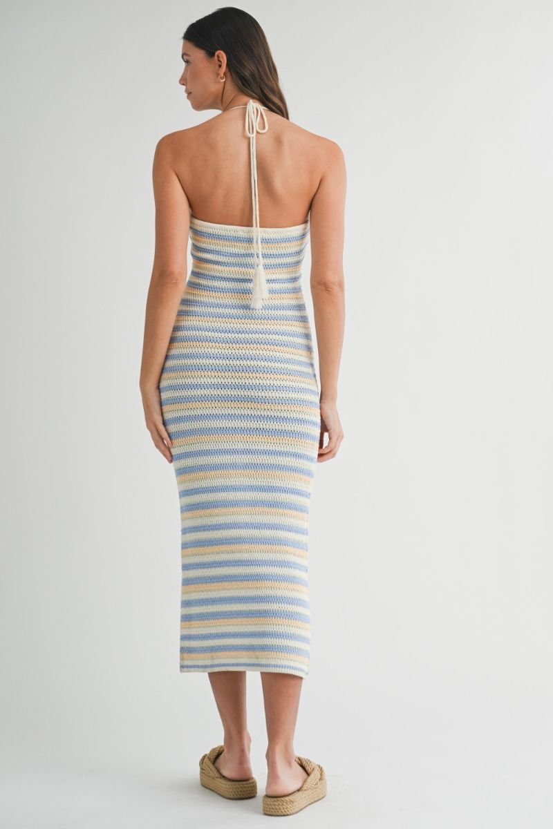 Multi color striped halter neckline open back sweater knit bodycon midi dress with side slit detail. Not see through.