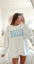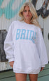 White coded crew with baby blue "BRIDE" bold lettering
