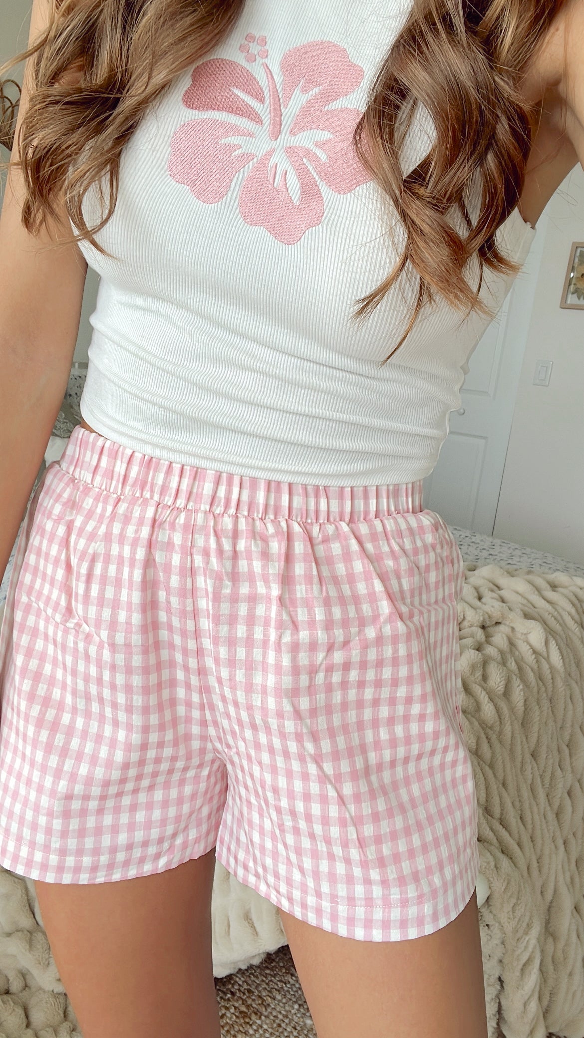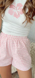 Ivory + pink boxer shorts with elastic waistband. Lined.