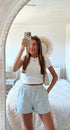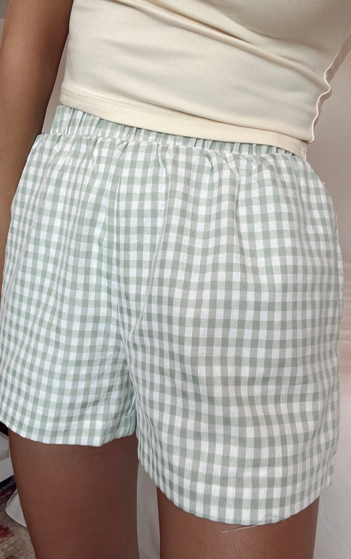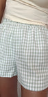 Ivory + blue or sage boxer shorts with elastic waistband. Lined.