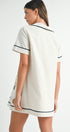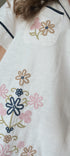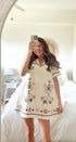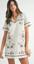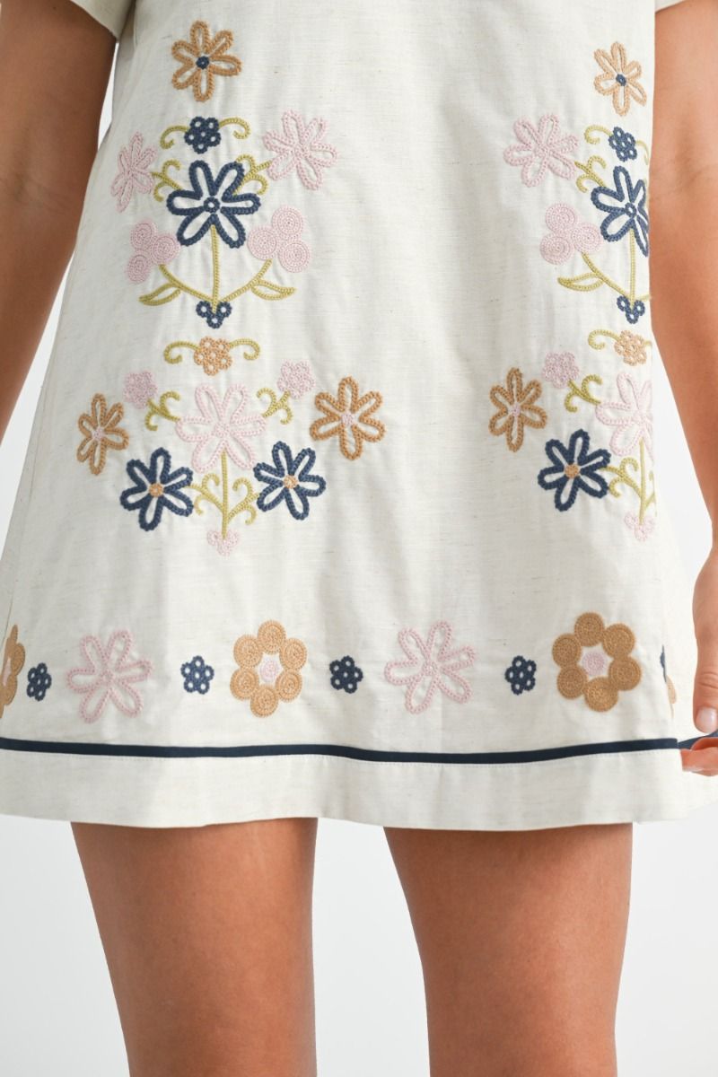 Short sleeve linen mix floral embroidery collared mini dress with contrast binding and collar detail. Lining.