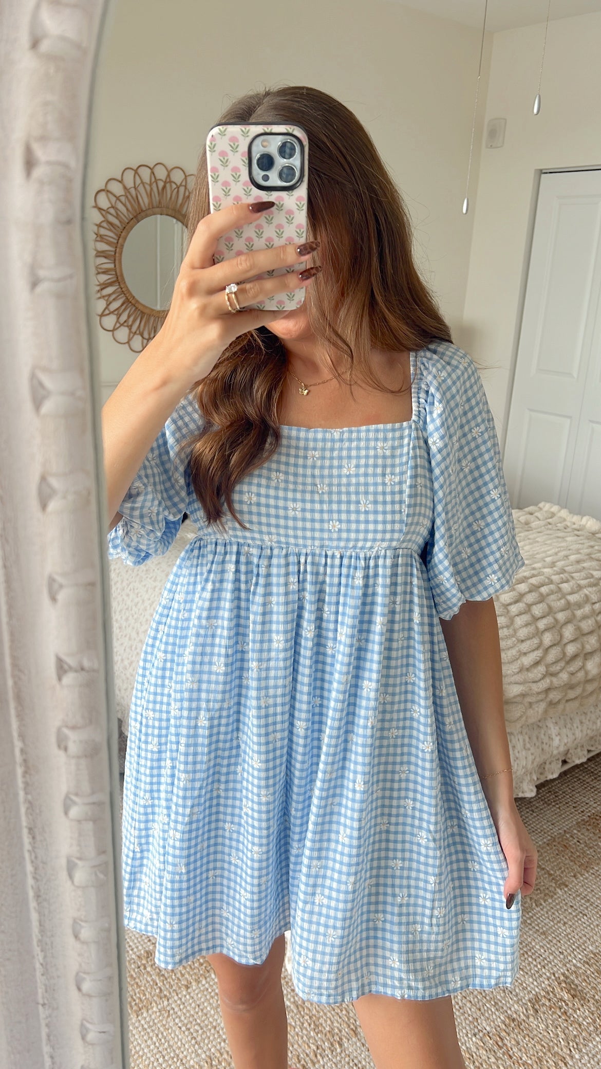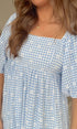 The Daybreak Babydoll Dress brings a touch of cottage charm into the cooler seasons. Crafted in lightweight gingham with delicate floral embroidery, it’s designed with a square neckline, puff sleeves, and open back.