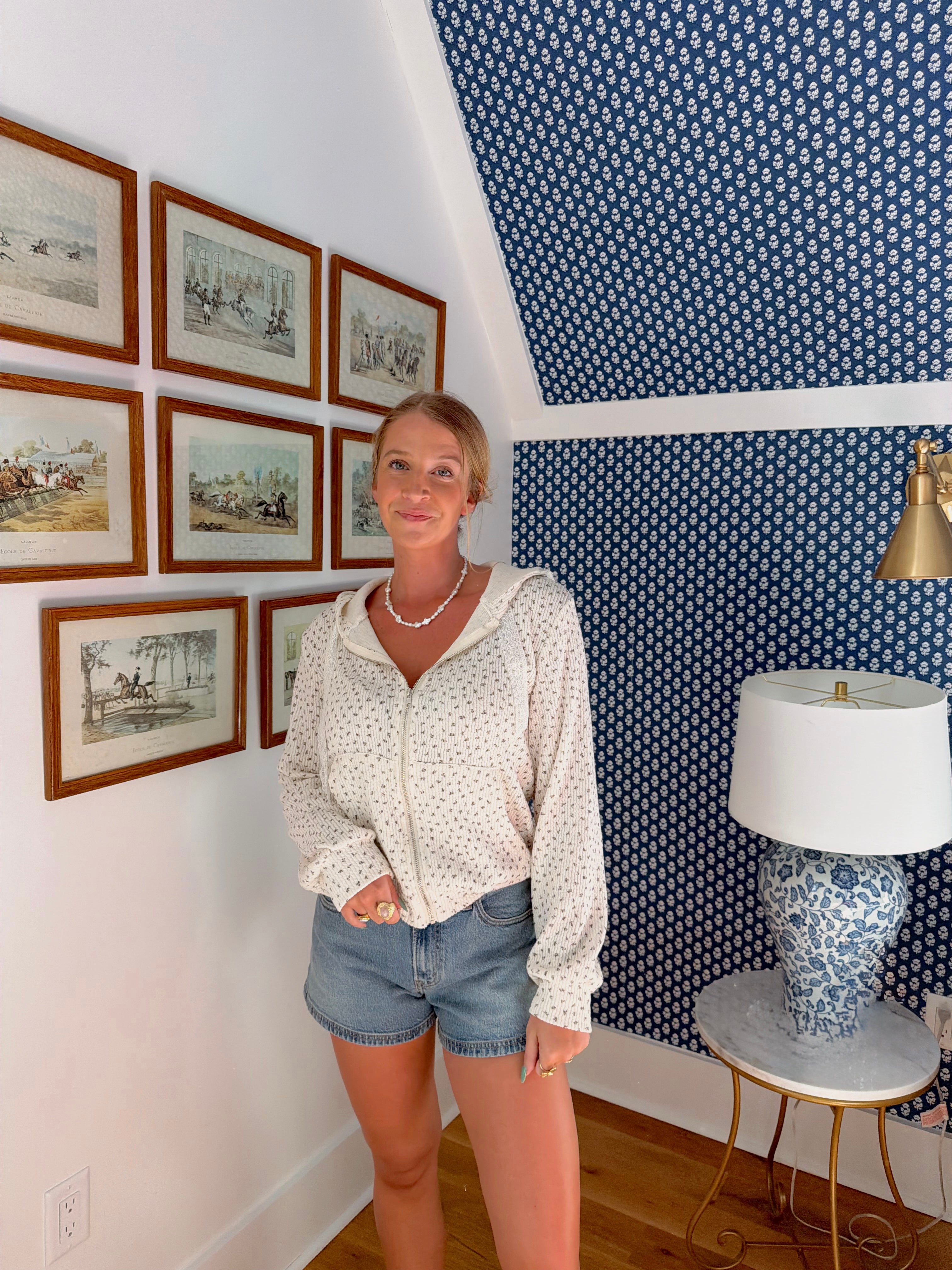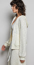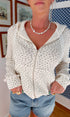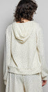 Designed with a subtle micro-floral pattern, this hoodie has a relaxed fit that feels laid-back while still looking put together. The full zip front makes it easy to throw on over tanks, tees, or lounge sets, while the lace drawstring detail adds a soft feminine touch that elevates the whole look.