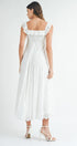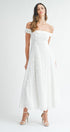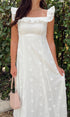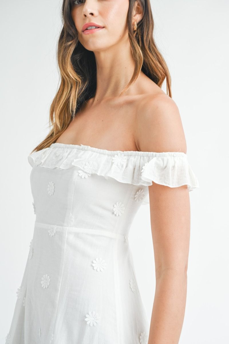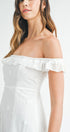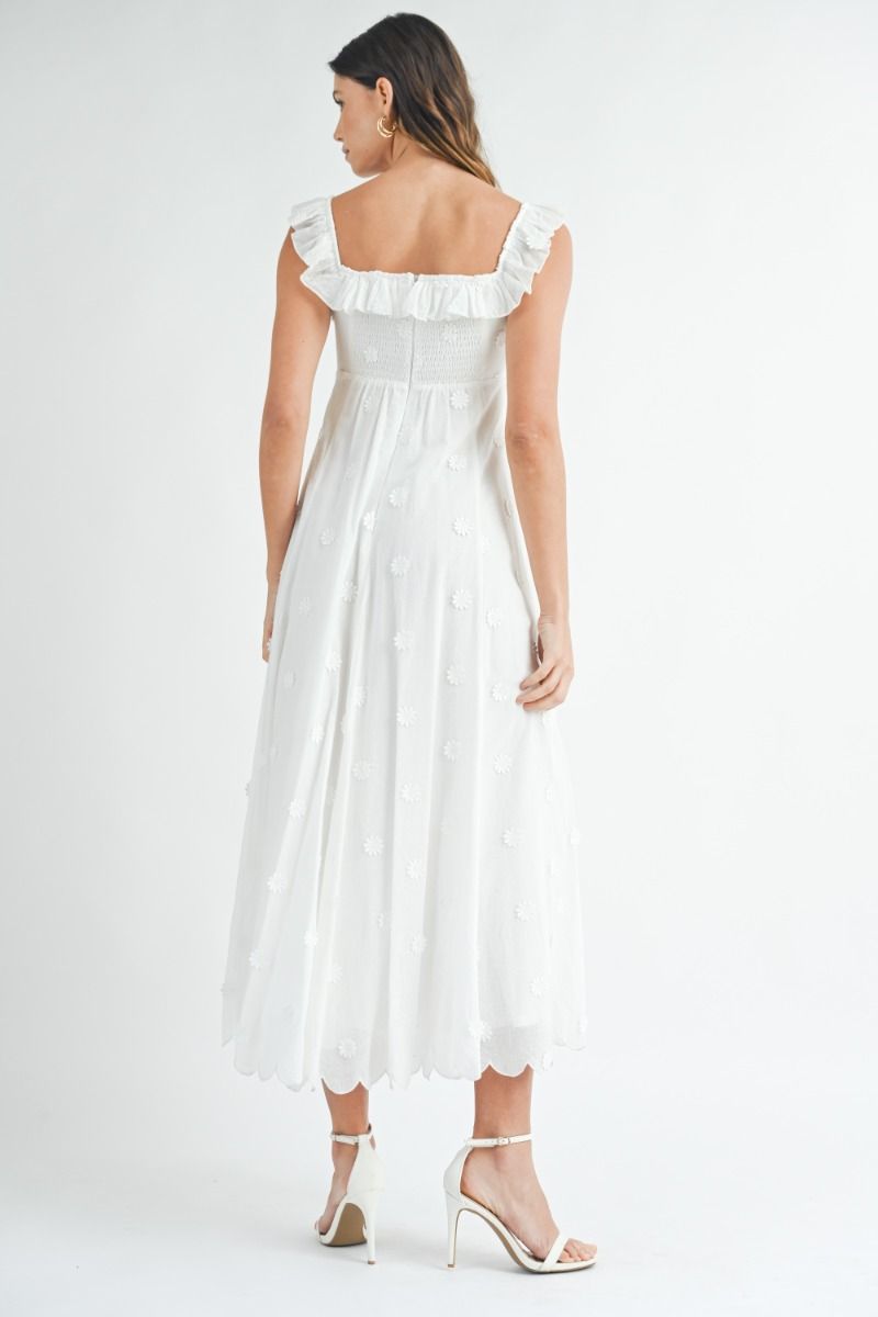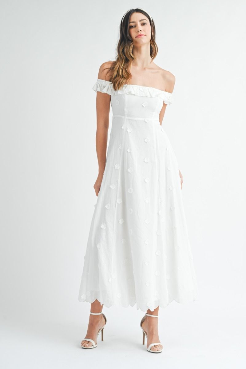 Textured floral print ruffle off shoulder midi dress with scallop hem. Back smocked and invisible zipper detail. Lining.