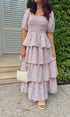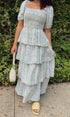 Floral smocked square neck short sleeve ruffle tiered maxi dress. Lined.