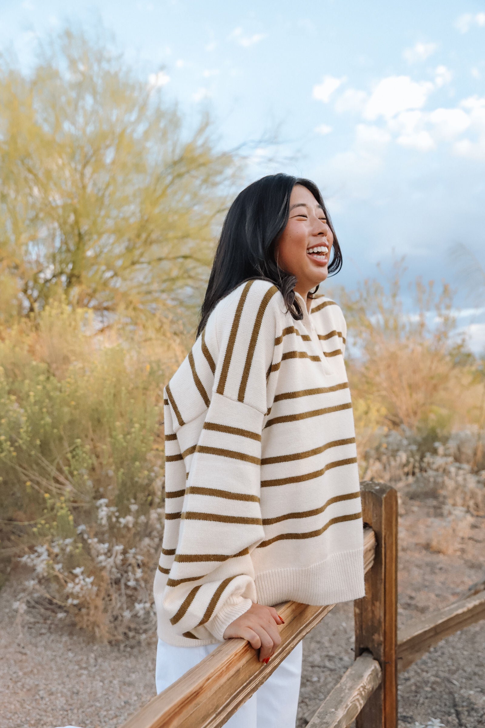 The Gia Pullover is basically fall in knit form. Oversized, striped, and ready for every cozy moment. Whether you’re heading out for a coffee date, strolling the farmers market, or curled up journaling with worship music on, this pullover is the easy throw-on you’ll keep reaching for.