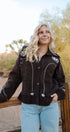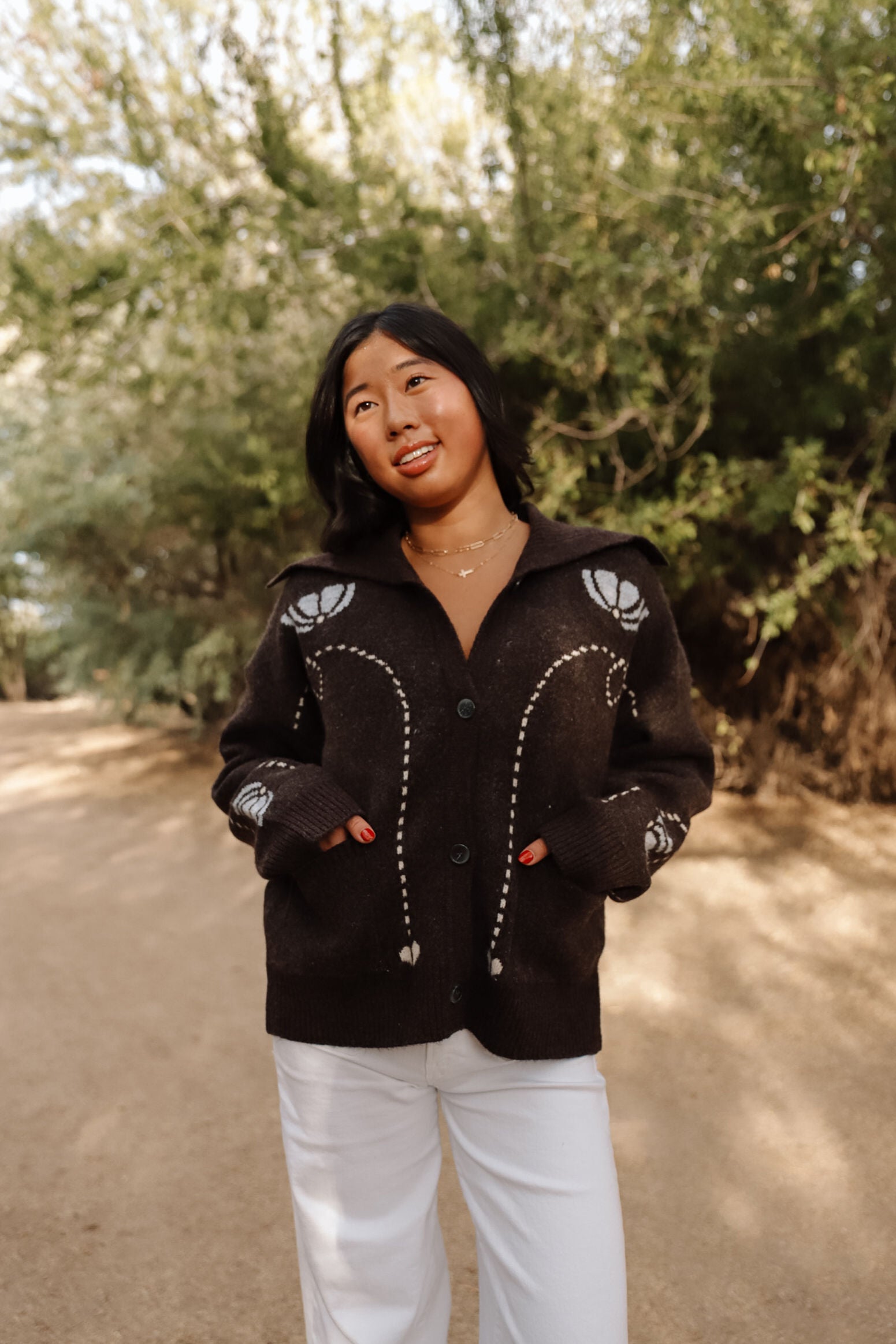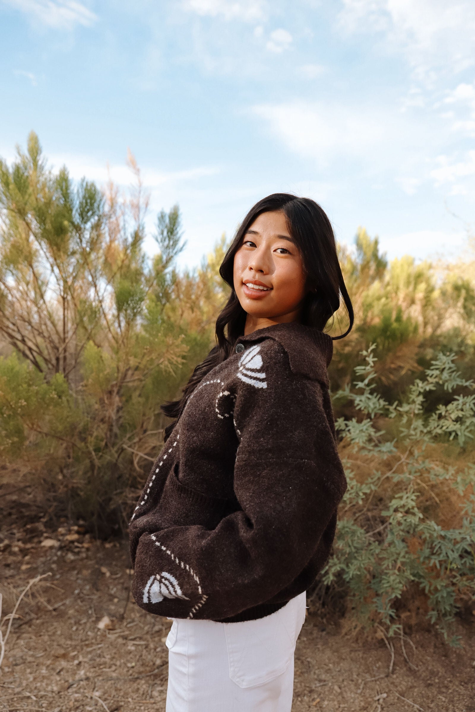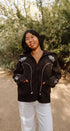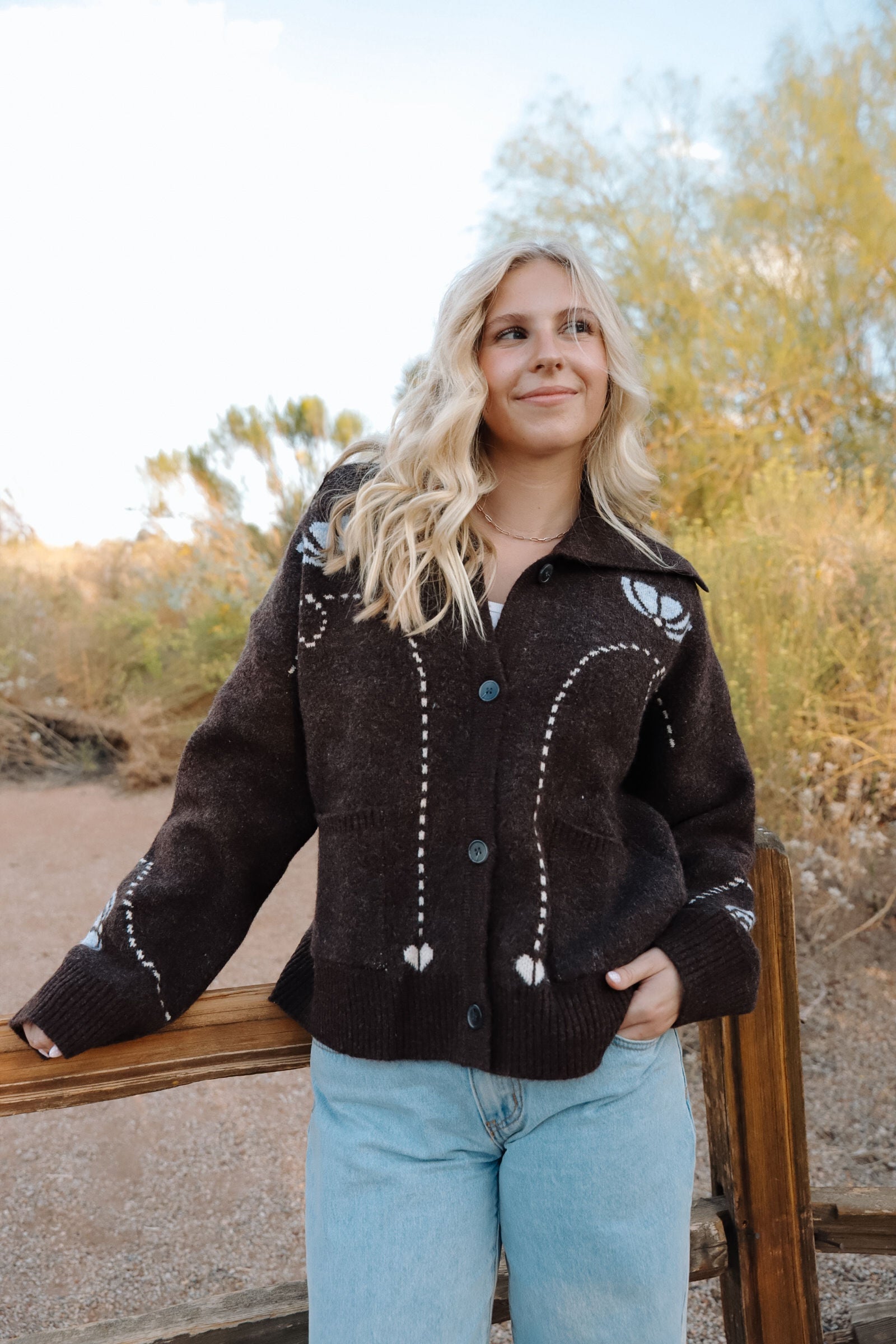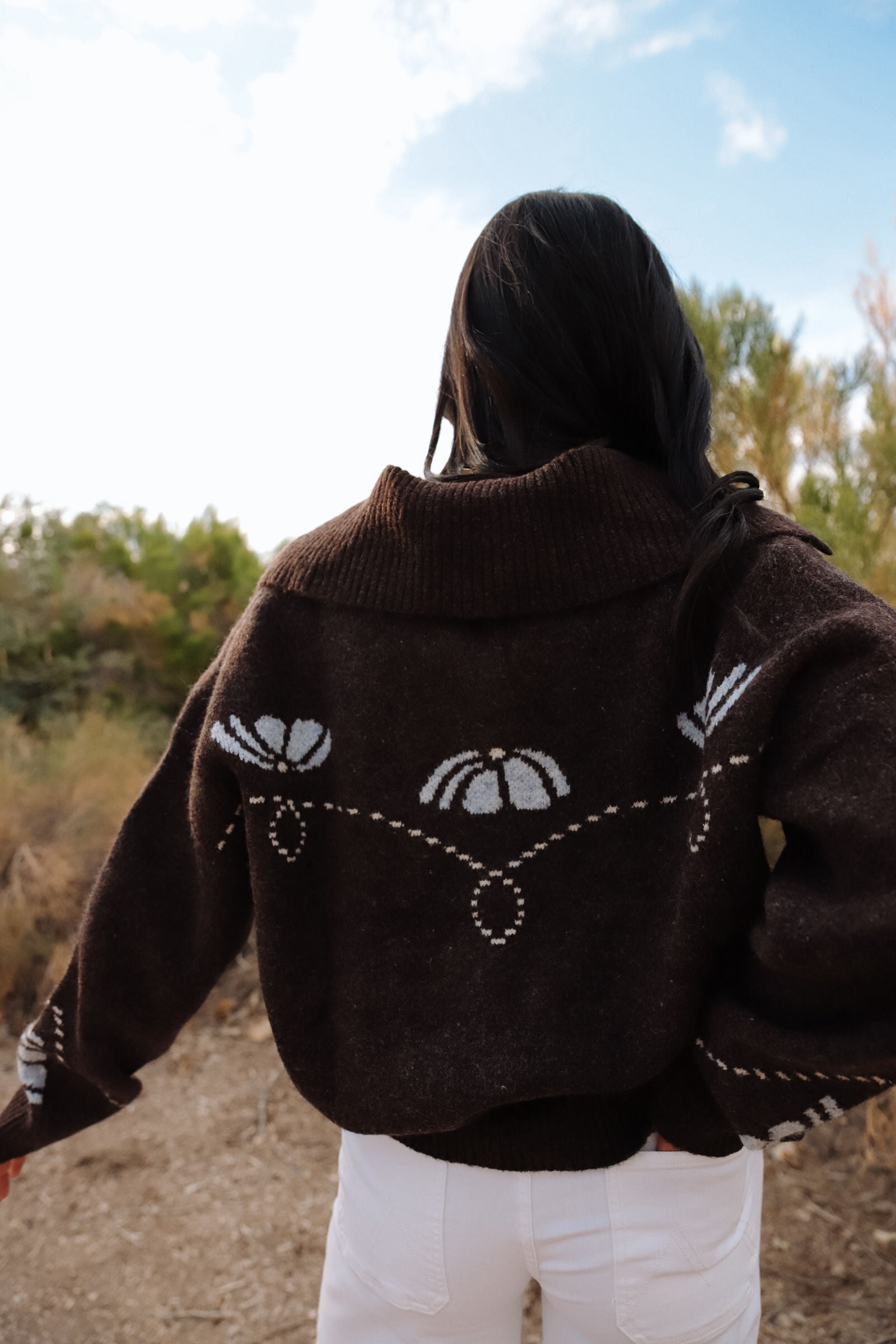 The Montana Sweater feels like a little piece of rustic charm you can wear anywhere. In a rich cocoa-brown knit, it’s decorated with soft ivory patterns and delicate stitched hearts that give it a sweet, handmade touch. The oversized collar and roomy fit make it perfect for layering — whether you’re sipping coffee on a chilly morning, bundling up for a Sunday stroll, or heading to small group in jeans and boots.