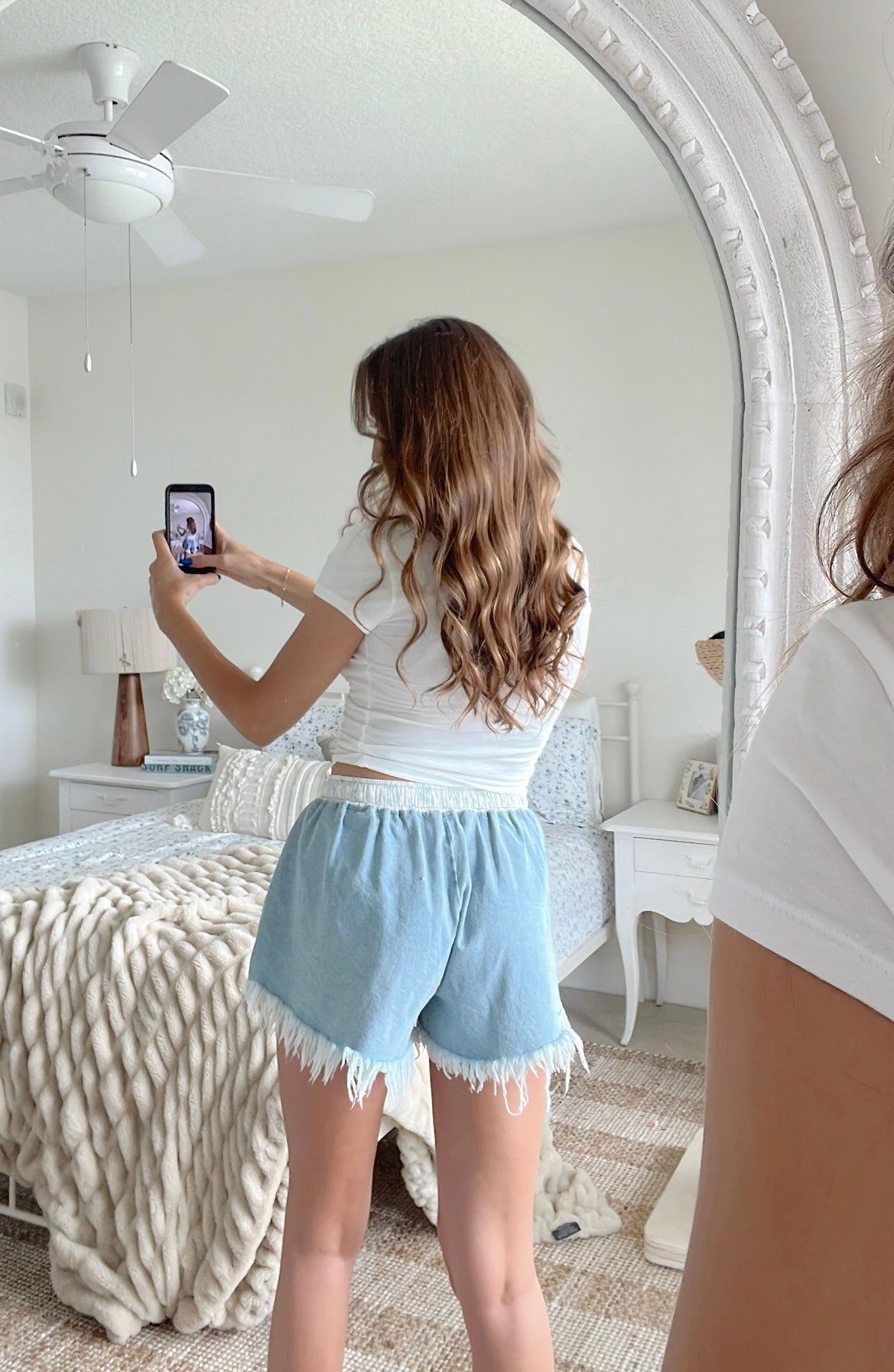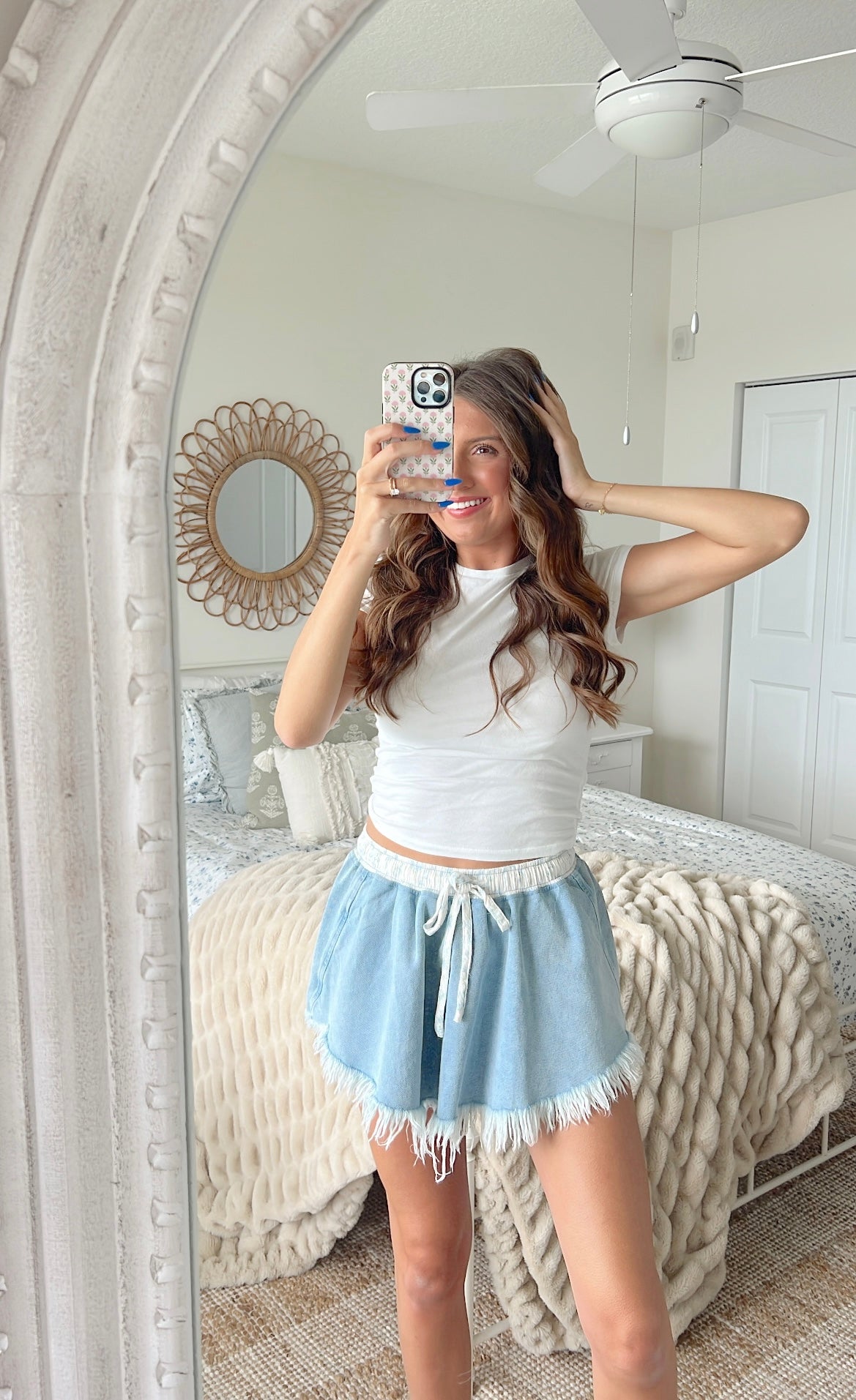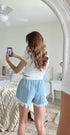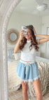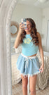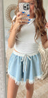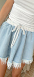 Frayed denim skort, featuring floral stretchy tie elastic waistband.