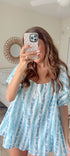 Blue/white floral printed eyelet front tie detailing easy fit romper