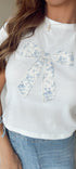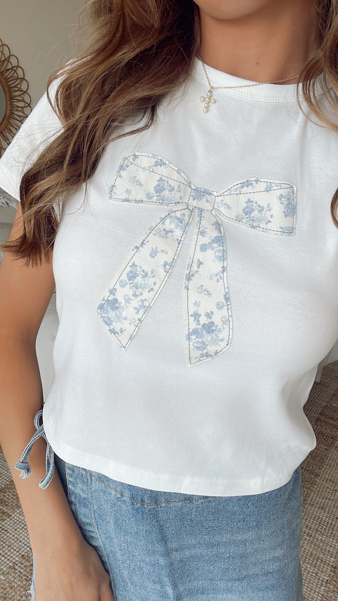 Short sleeve round neck contrast patchwork bow baby tee (blue and white)
