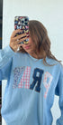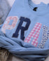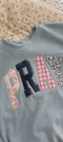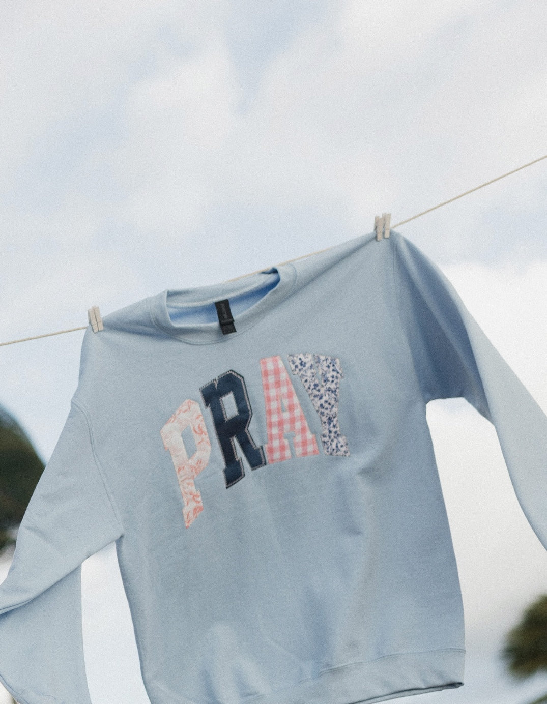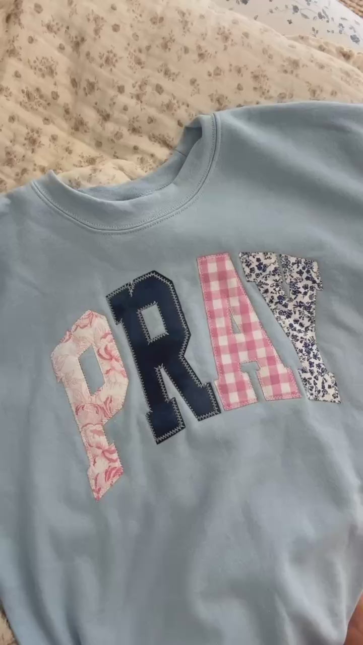 Handmade patchwork pray crewneck! Crafted on a cozy light blue crewneck, each letter is appliquéd by hand with a mix of floral, gingham, and solid prints, creating a one-of-a-kind patchwork design. Thoughtfully made with care and comfort in mind, it’s the perfect blend of encouragement, warmth, and vintage-inspired charm.