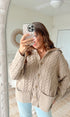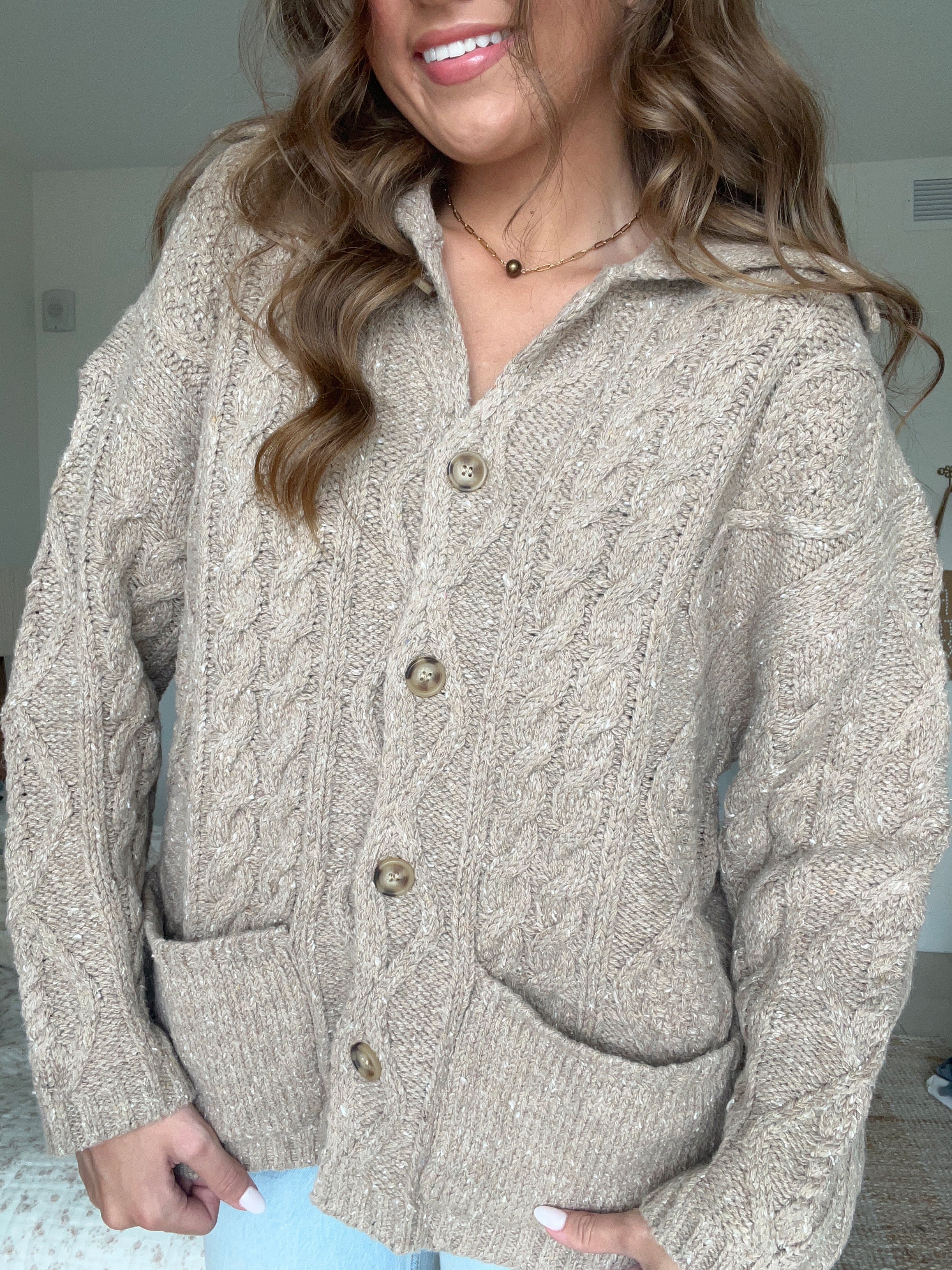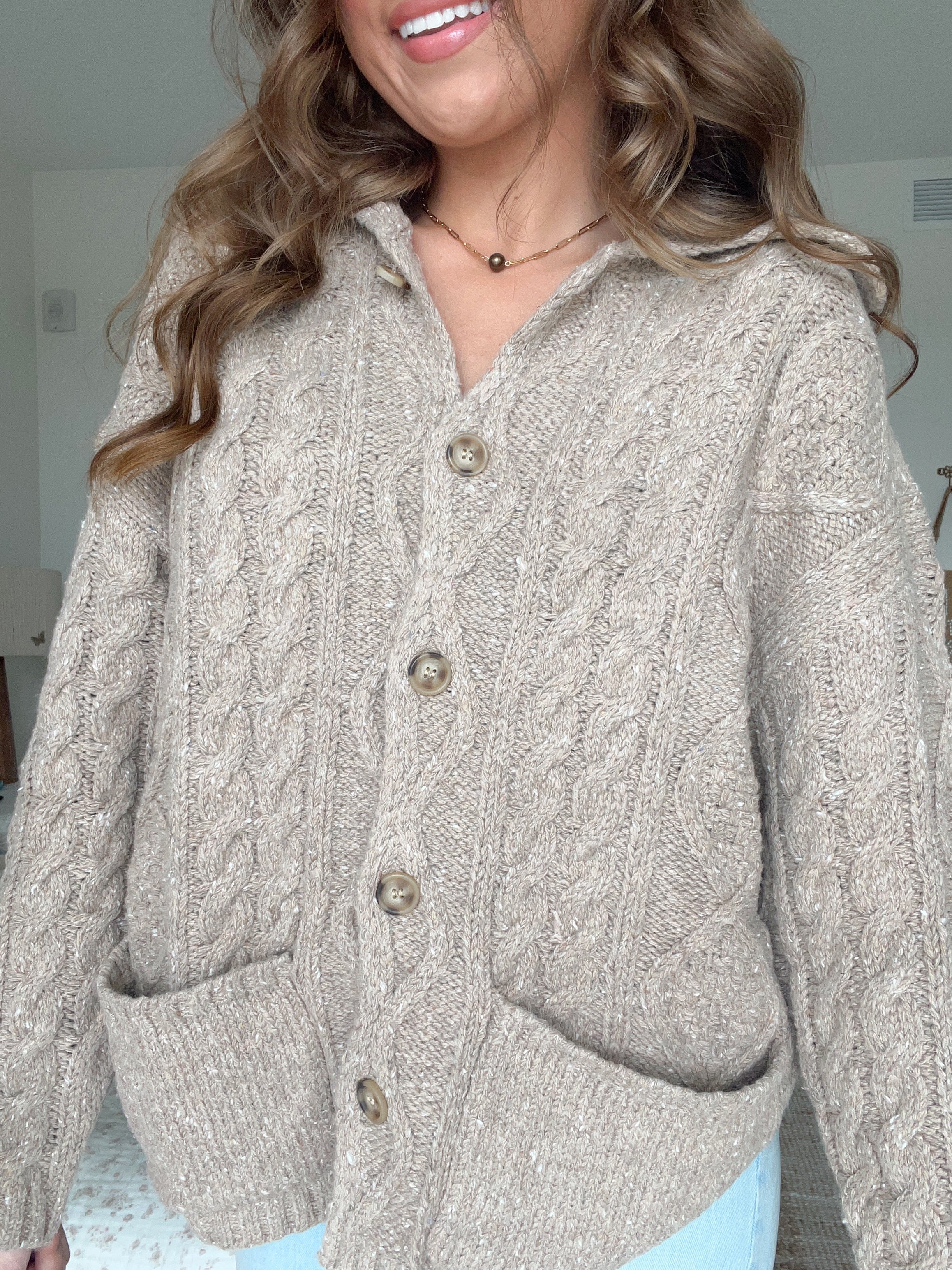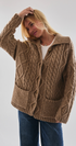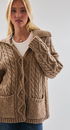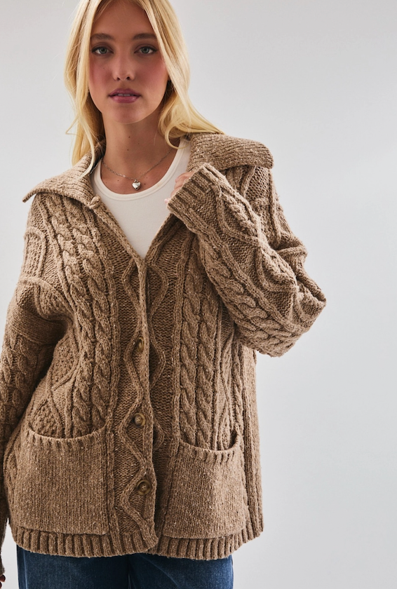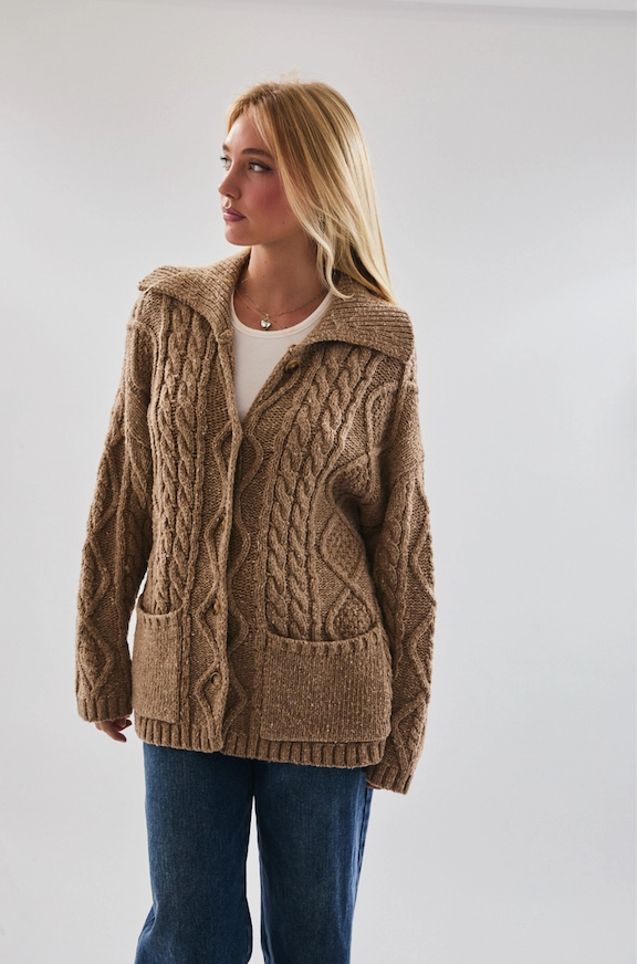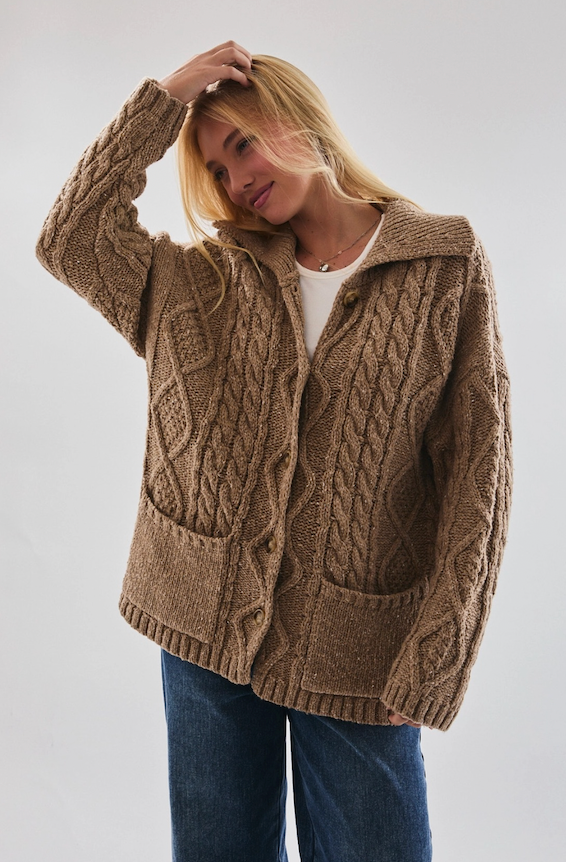 The Renna Chunky Cardigan is a cozy knit layer with a relaxed, oversized fit. Designed with a textured cable pattern, large tortoise buttons, front patch pockets, and a laid-back collar. Made for easy styling through the colder months, this cardigan is available in two colors—oat and espresso.