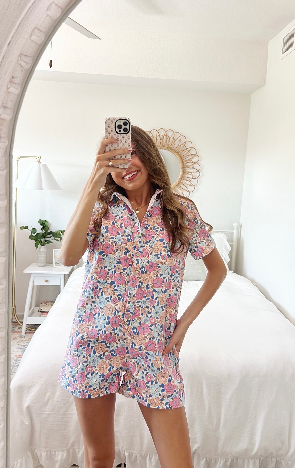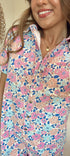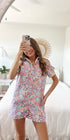 Corduroy multi floral print romper. It exhibits a collar, short sleeves with rolled edges (rolled leg edges), and bust pockets. It has a center button-up, side inseam pockets, yoke back, and back pockets.