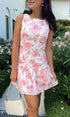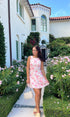 Pink and white floral eyelet mini dress with drop waist and bow detailing