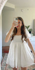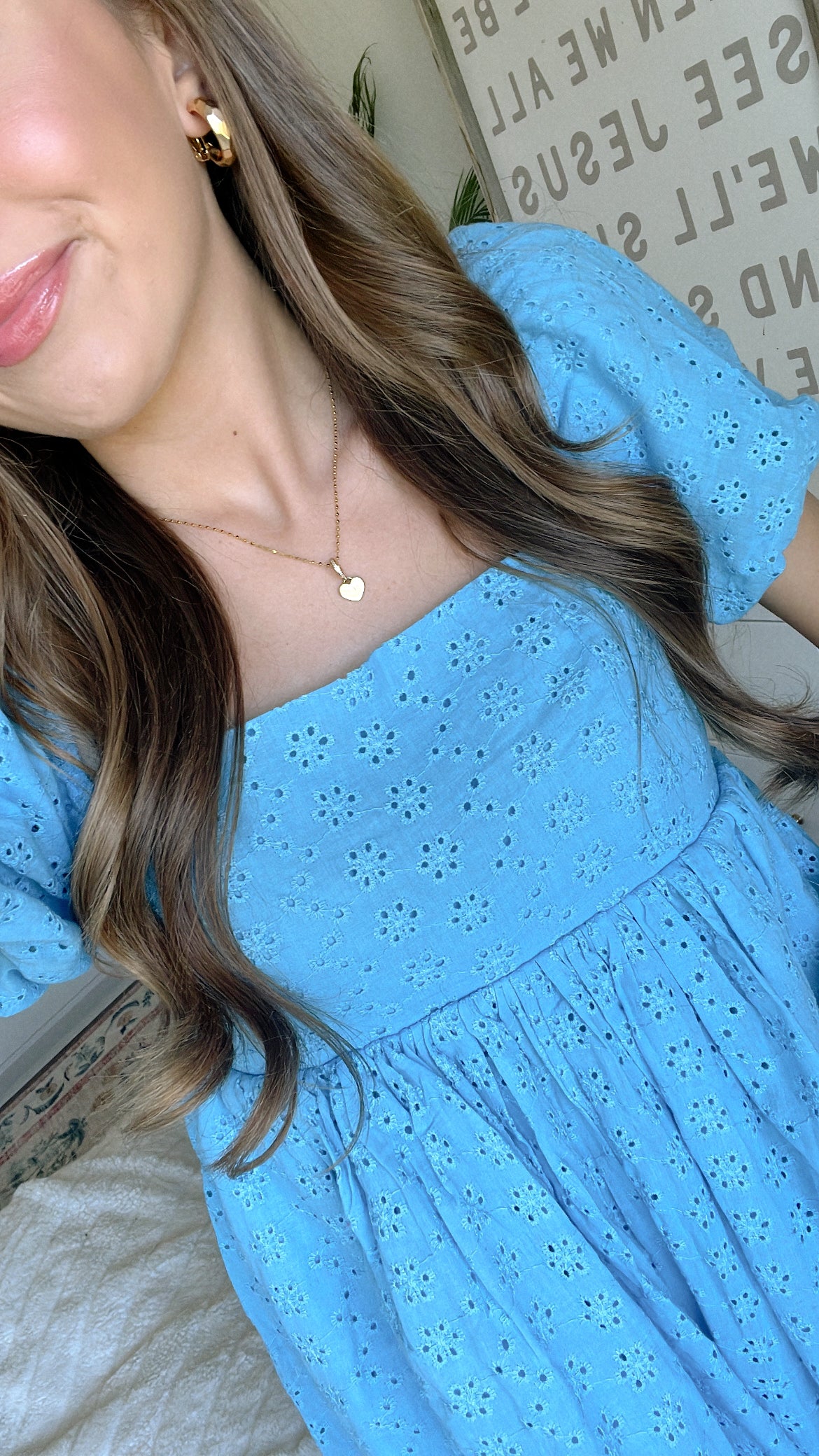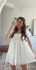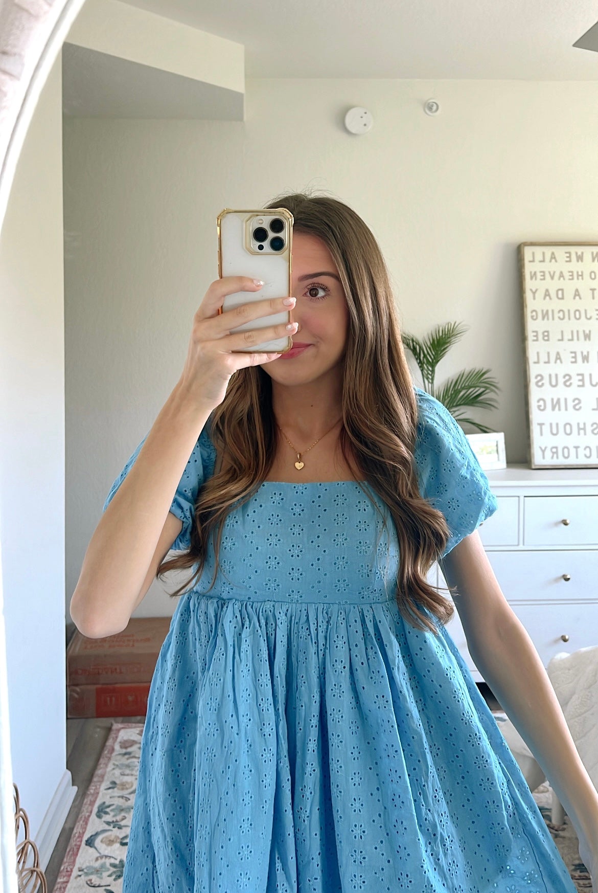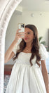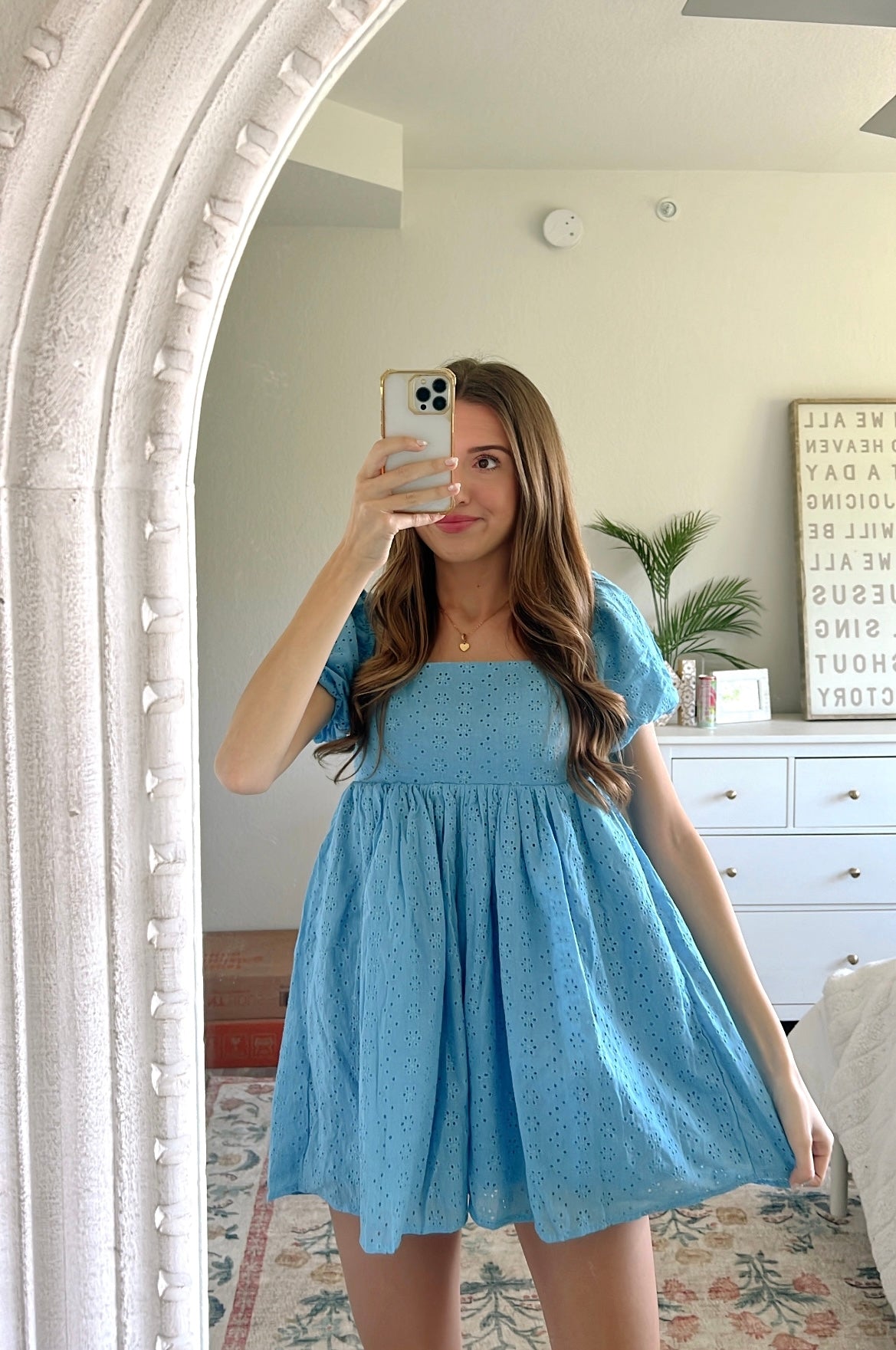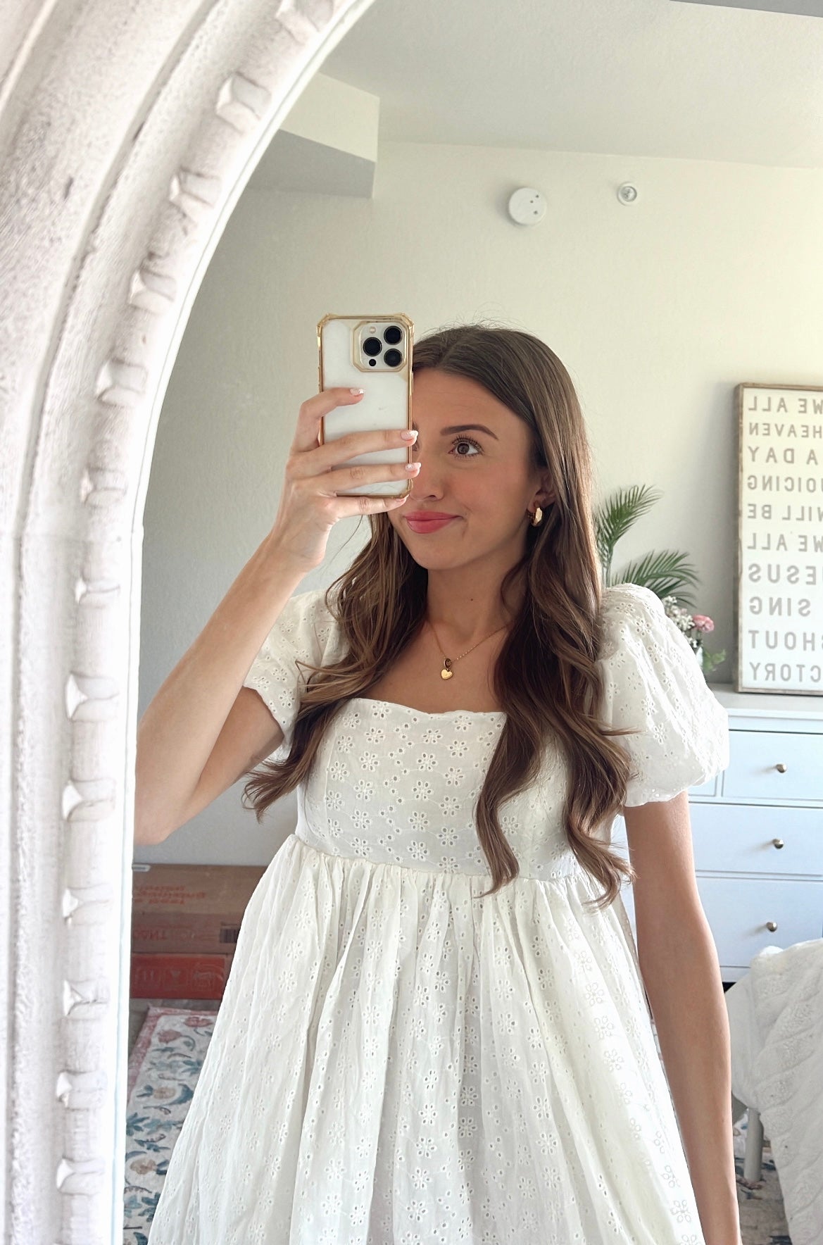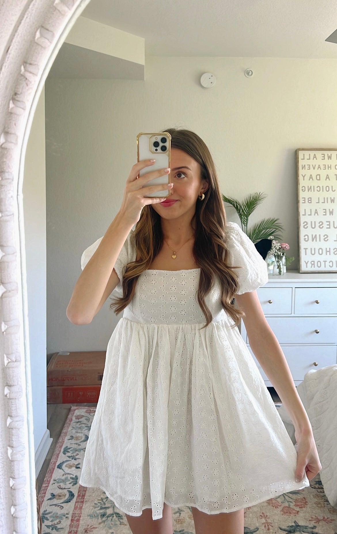 Lined eyelet lace square neckline, babydoll mini romper with puff sleeve and smocked back detailing with invisible back zipper