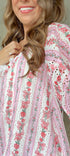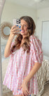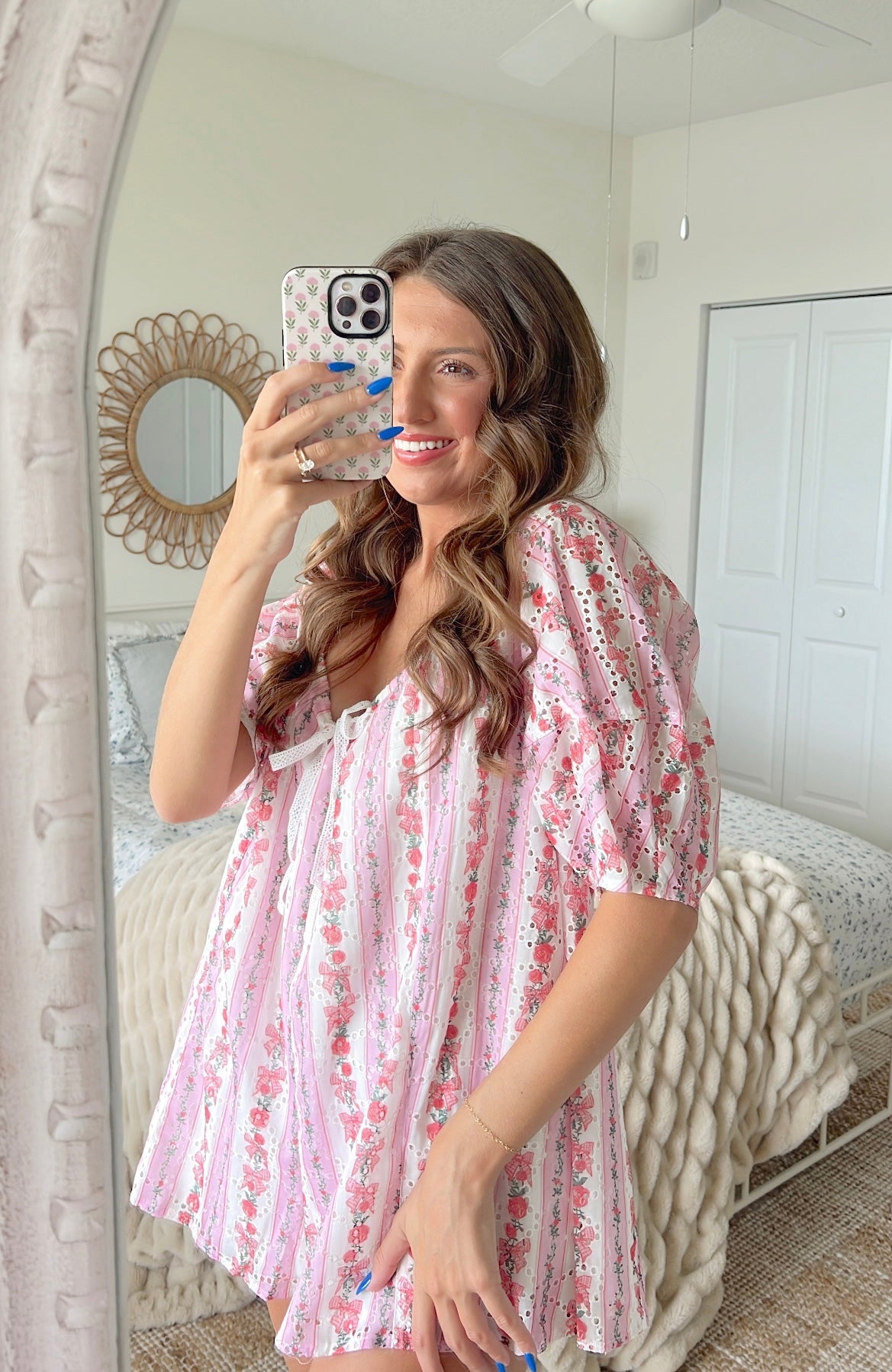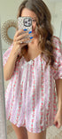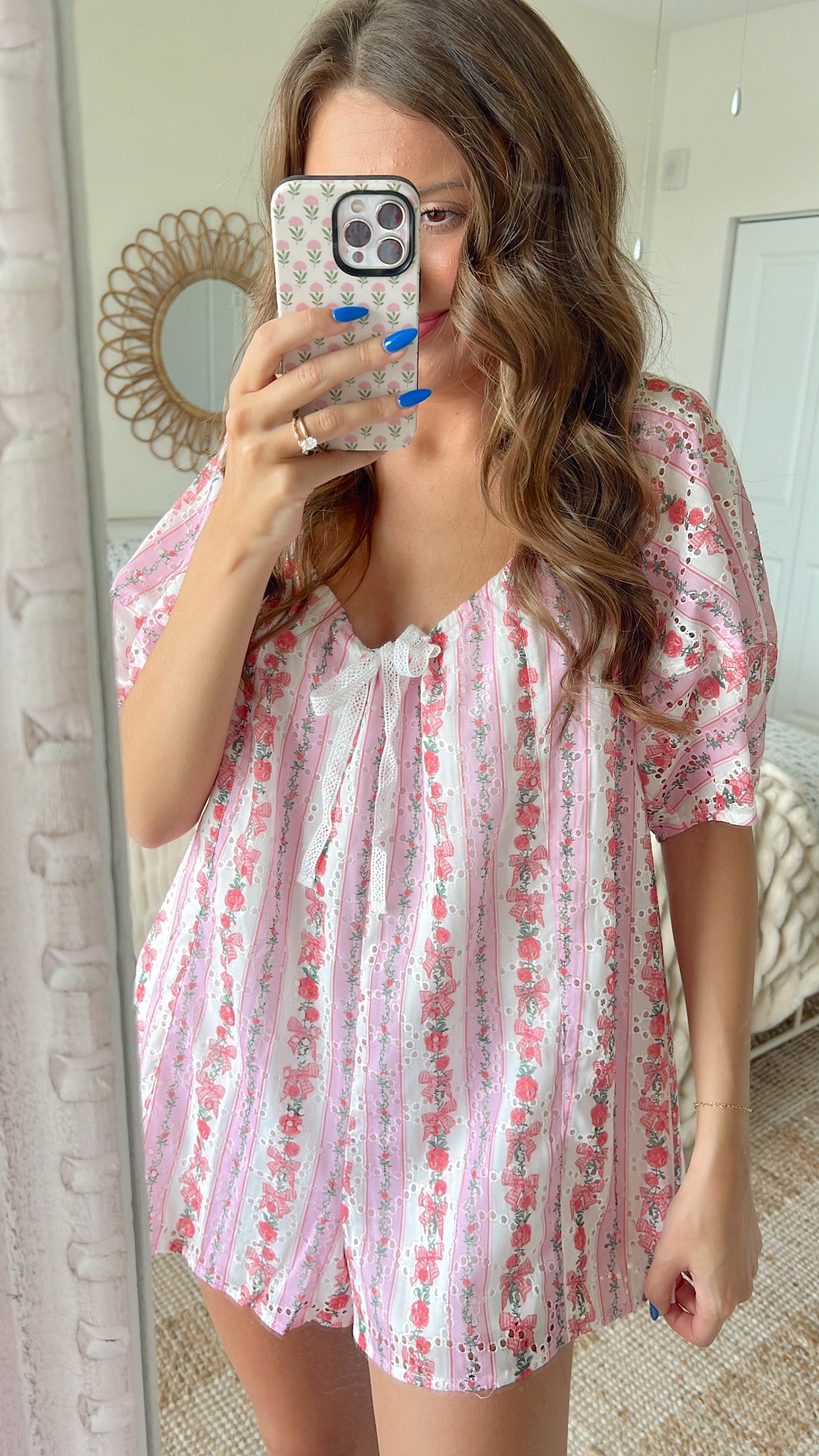 Pink, red, and white bow floral printed eyelet front tie detail easy fit romper