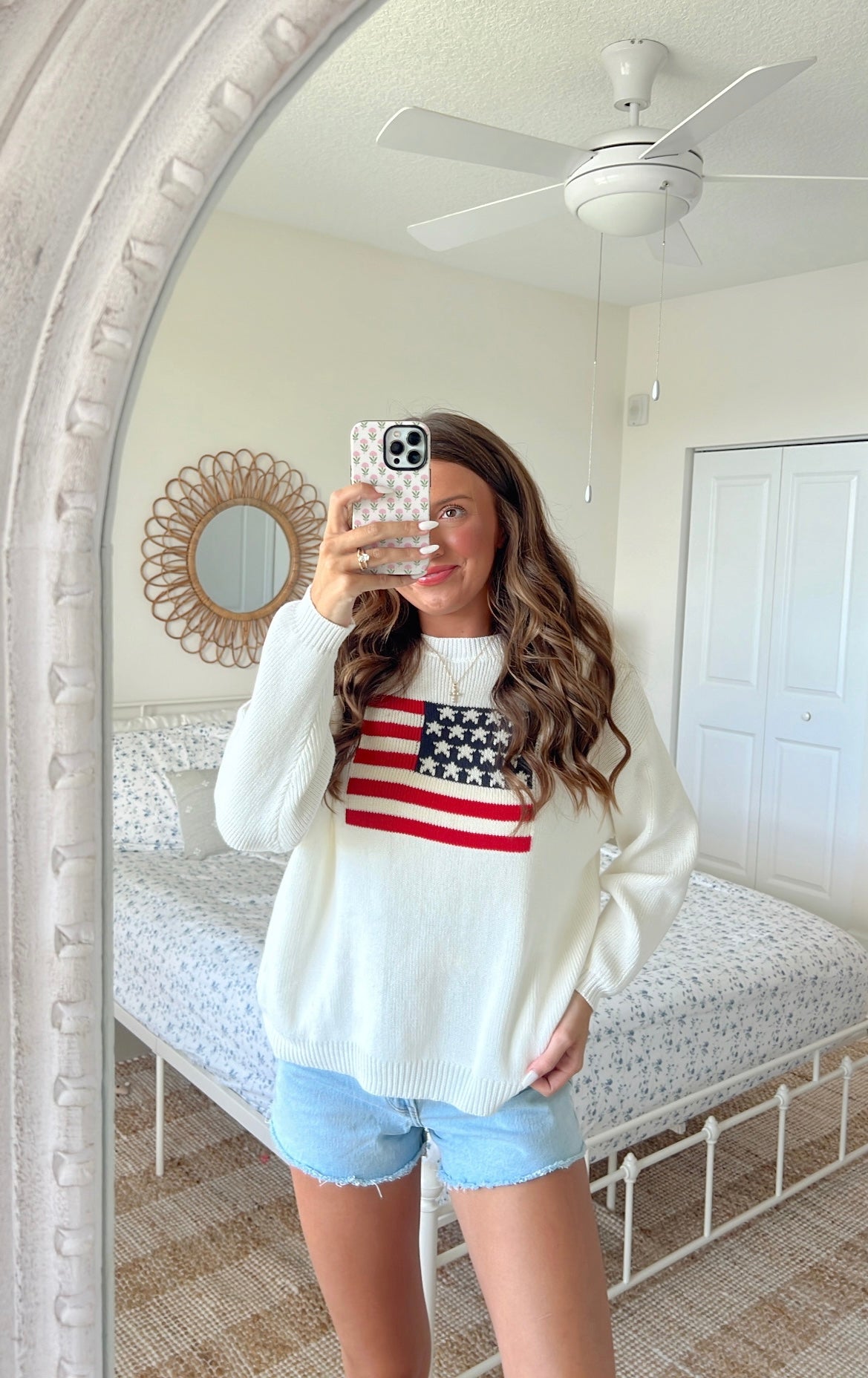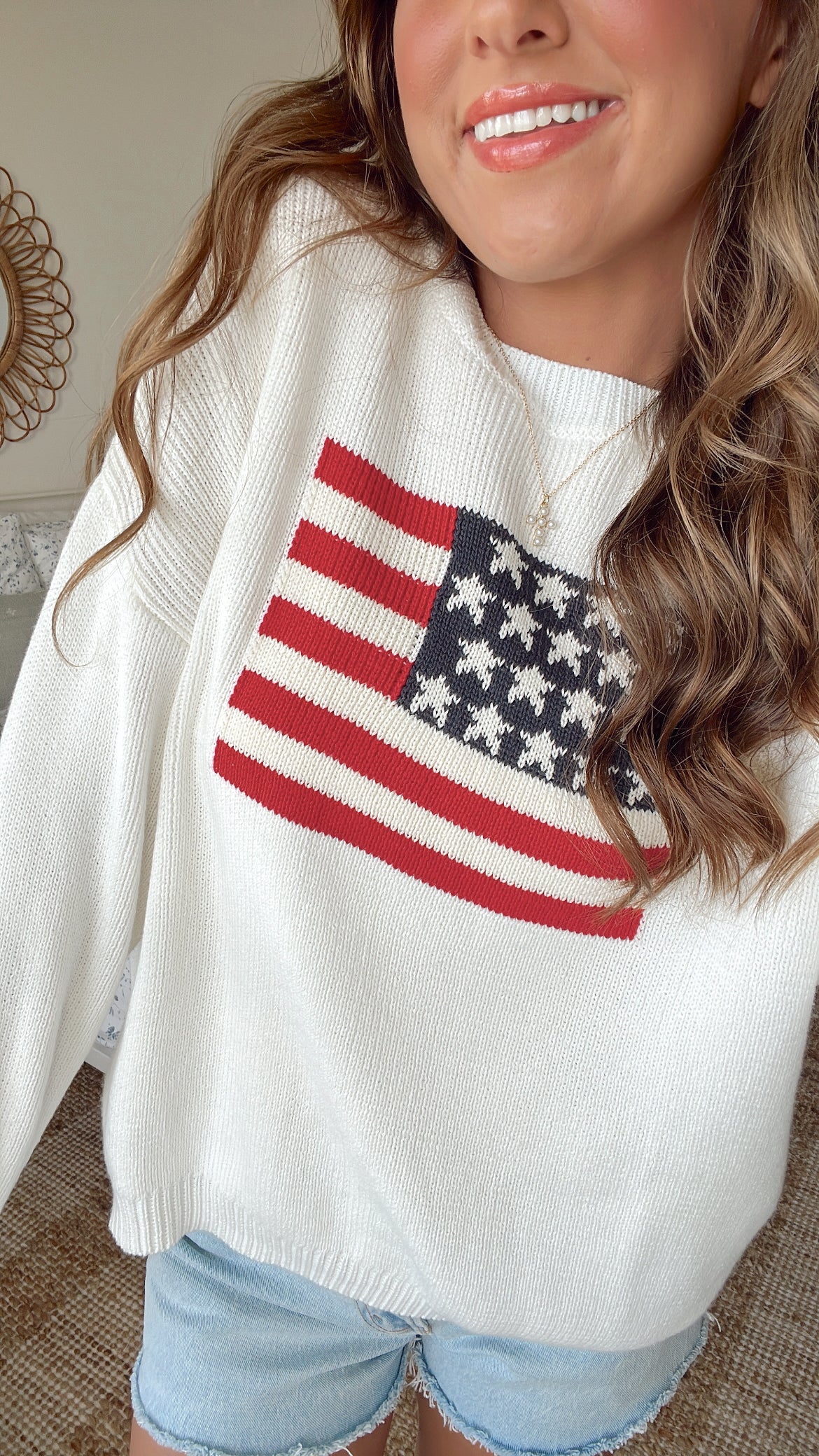 Lightweight knit you can style all year round, ivory knit sweater with red and blue American flag stitch detailing