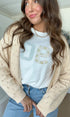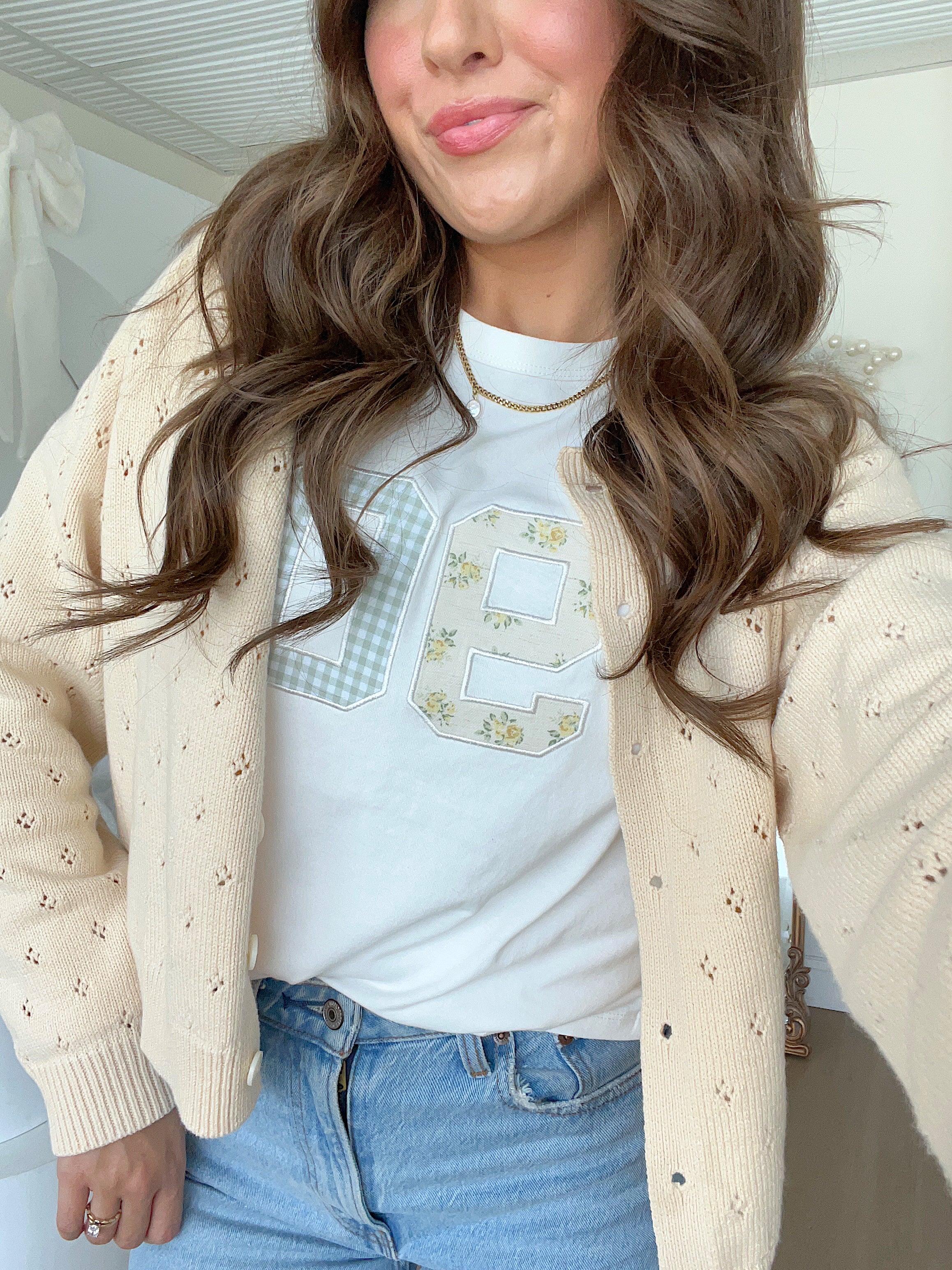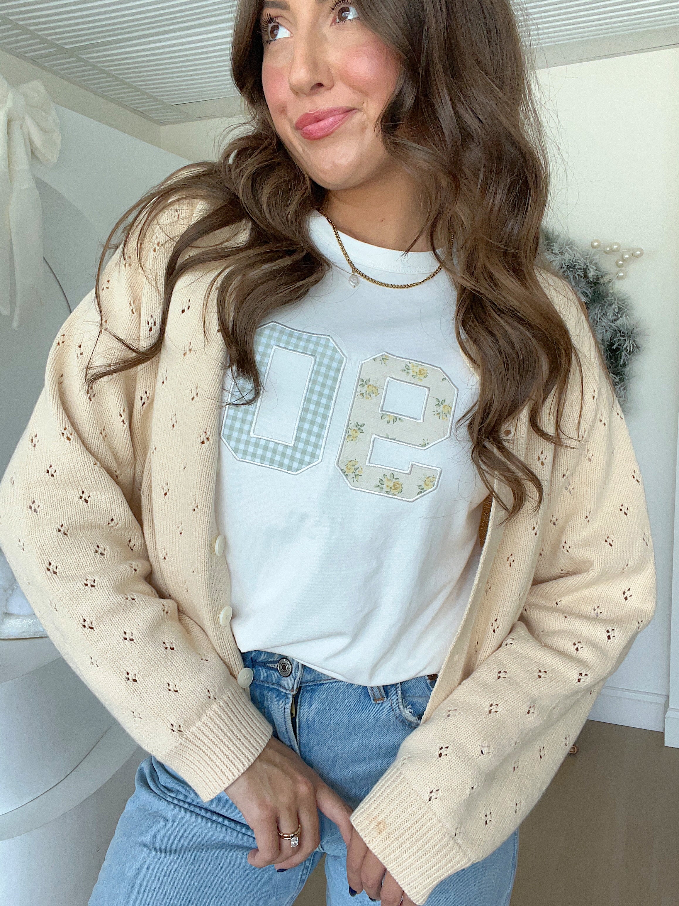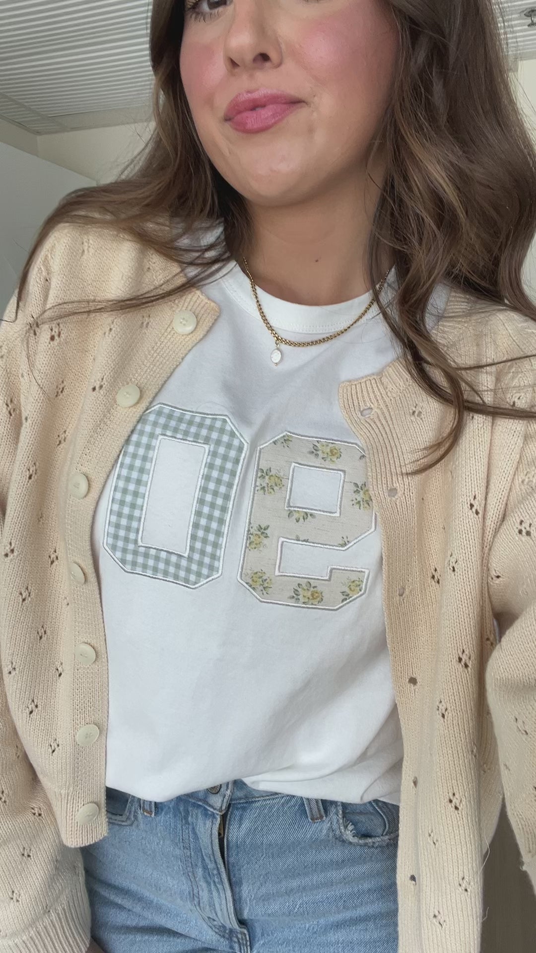 A simple tee with the sweetest stitched details. The Ninety Tee features mixed-fabric appliqué numbers, one in a tiny floral print and one in a soft gingham, giving it that subtle patchwork look that feels cozy, feminine, and a little vintage-inspired.