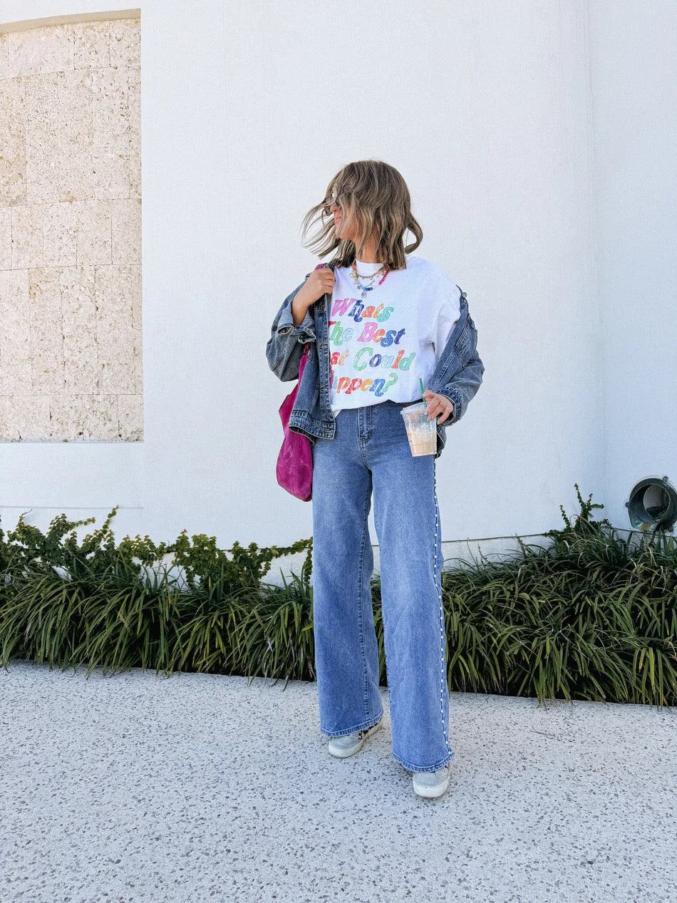Embrace optimism with this laid-back white tee featuring "What's The Best That Could Happen?" splashed across the chest in a vibrant, swirly retro-modern font. Perfect for anyone who loves a little positivity with their everyday style, this casual essential pairs effortlessly with jeans, shorts, or your favorite bottoms. The true heart of the Happy Threads Edit!